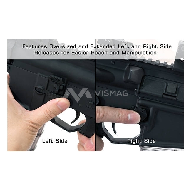 Obustronny zwalniacz magazynka do platformy AR15 wykonany ze stali oraz aluminium. Jego obsługa jest wygodna zarówno w użytku lewo- jak i prawostronnym. Wygodną konstrukcję wyposażono w antypoślizgowe przyciski. Jego instalacja jest łatwa i intuicyjna, tak samo jak użycie. Producent do zestawu dołącza niezbędne akcesoria montażowe.