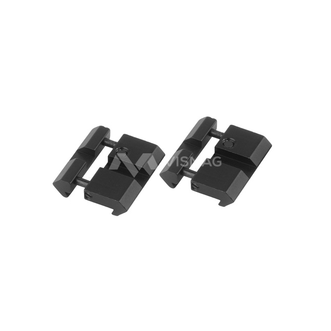 Adaptery na płaską szynę trapezowatą Dovetail o szerokości 11 mm, umożliwiające montowanie na niej akcesoriów w systemie Weaver / Picatinny 21 mm. Wykonane z aluminium anodowanego na czarno. Posiadają blokowany na wkręcane piny mechanizm mocujący ze sprężynami, przez co dopasowują się do kształtu szyny. Przeznaczone do stosowania na wyposażonych w szynę Dovetail 11 mm wiatrówkach i broni palnej kalibru .22. W zestawie znajdują się dwie sztuki, każda z dołączonym kluczem imbusowym.