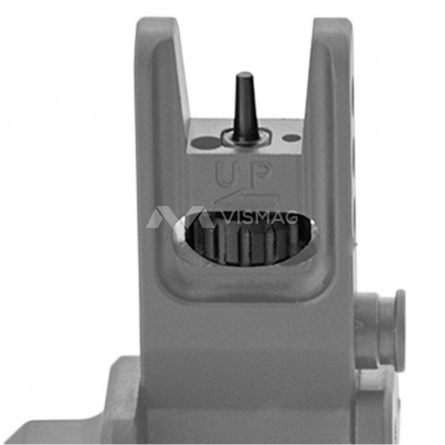 Do rozkładania celownika zastosowany sprężynujący przycisk, który nie tylko błyskawicznie rozkłada muszkę, ale także stabilnie blokuje ją w dolnej pozycji. Sprężynujący zawias jest odporny na odrzut broni i upadek, dlatego celownik nie zawodzie nas w krytycznym momencie. Muszka Leapers UTG podobnie jak klasyczna A2 ma słupek o regulowanej wysokości, z tą jednak różnicą, że to regulacji nie potrzebujemy specjalnego narzędzia. Nastawę muszki w łatwy sposób zmieniamy za pomocą moletowanego pierścienia.. Za zachowanie zera oraz stabilne osadzenie muszki na szynie Picatinny MIL-STD-1913 odpowiada stalowa śruba o prostokątnym profilu.
