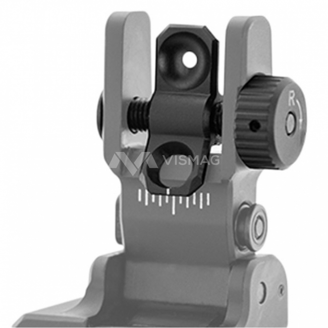 Do rozkładania przeziernika zastosowany sprężynujący przycisk, który nie tylko błyskawicznie aktywuje celownik, ale także stabilnie blokuje go w dolnej pozycji. Sprężynujący zawias jest odporny na odrzut broni i upadek, dlatego celownik nie zawodzie nas w krytycznym momencie. Przeziernik ma dwie nastawy dedykowane do strzelania na krótkim i średnim dystansie. Położenie szczerbiny w poziomie można regulować za pomocą moletowanego pierścienia, co ułatwia zmianę nastawy w rękawicach strzeleckich. Za zachowanie zera oraz stabilne osadzenie szczerbiny na szynie Picatinny MIL-STD-1913 odpowiada stalowa śruba o prostokątnym profilu.