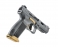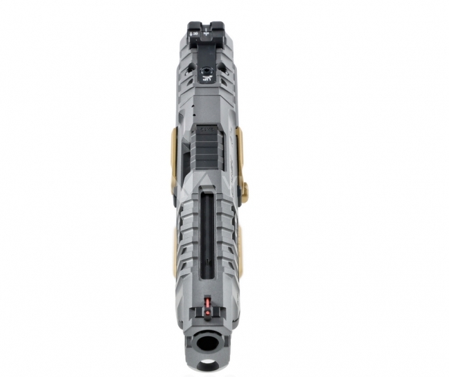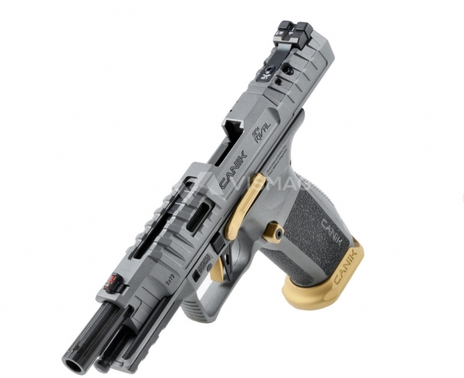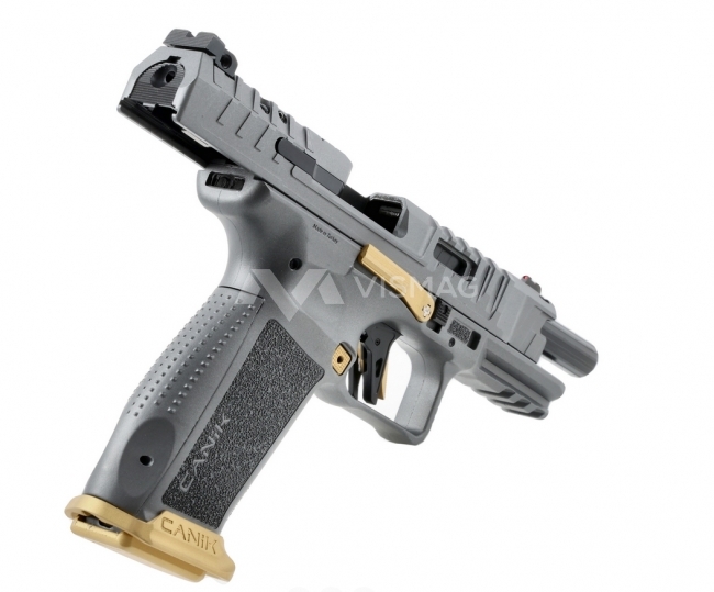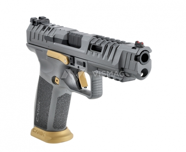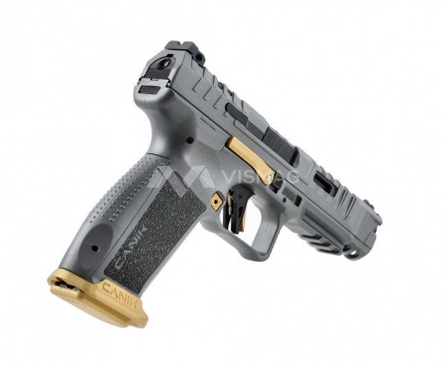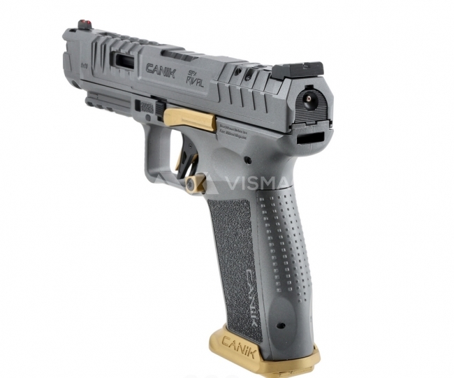 Pistolet świetnie się prezentuje, jego charakterystyczny wygląd podkreślony jest poprzez użytą powłokę cerakote koloru Canik Rival Grey dedykowaną tylko i wyłącznie tylko do tego pistoletu oraz użyty kolor złoty na części elementów pistoletu, takich jak: zrzut magazynka, zrzut zamka, spust, magwell oraz stopka magazynka.