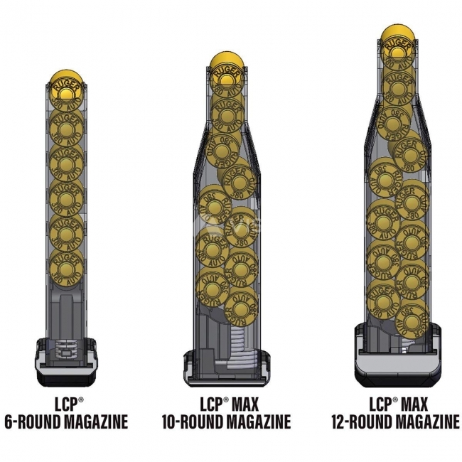 - Wyposażony w komorę .380 Auto, Ruger® LCP® MAX ma pojemność magazynka 10 + 1 z płaską płytką magazynka lub 12+1 ze stopką.