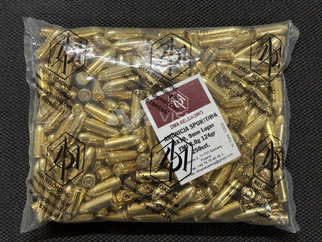 Elaborowana amunicja pełnopłaszczowa kal. 9×19 mm 8 g/124 grs FMJ wytwórni DMA. Pakowana po 250 sztuk w opakowaniu.
